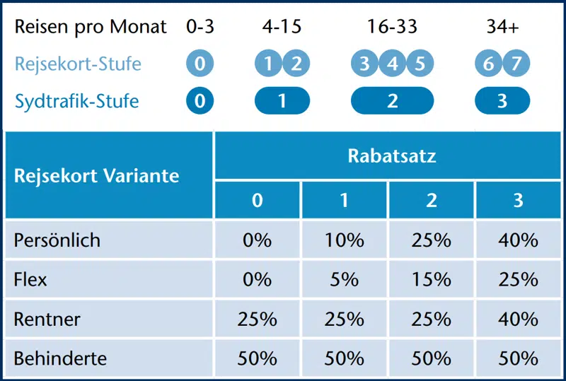 Rejsekort arbeitet mit 8 Rabattstufen (Stufe 0-7), die Sydtrafk in 4 Rabattsätze (Satz 0-3) umgewandelt hat.